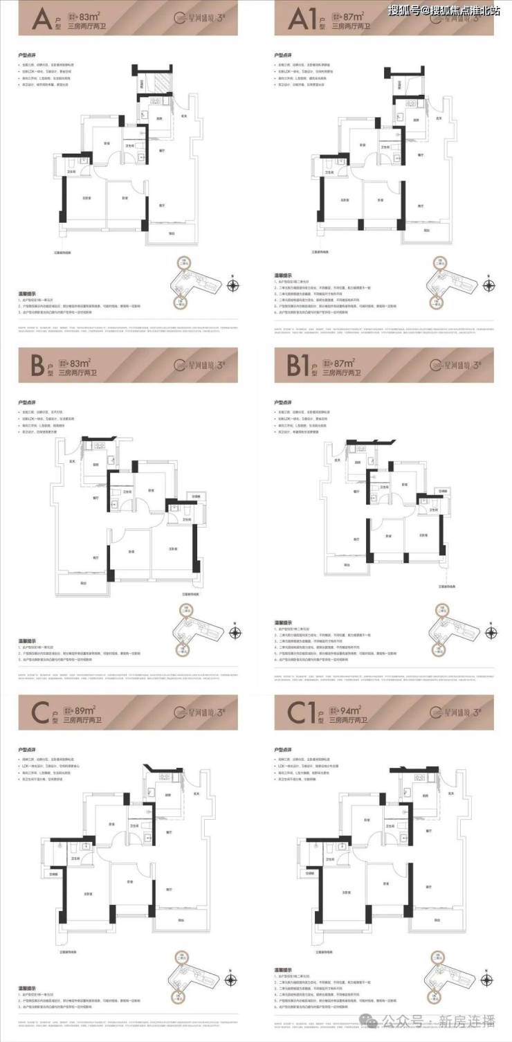 89-94平:3房2厅2卫,套内净使用率在80%,东南朝向