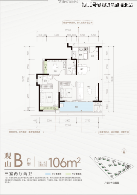 C户型:建面约105㎡,三房两厅两卫(102套)。独立玄关设计,南北双阳台,空间通透全明,超大观景飘窗,可拥揽社区四季美景。