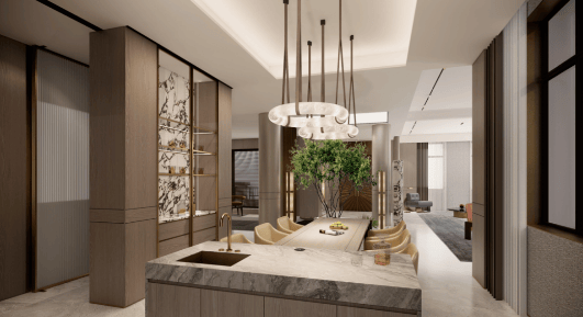 自然美学:以“临水而居”为理念,融入水波、光影等元素,打造开阔通透的空间,最大化引入自然景观。