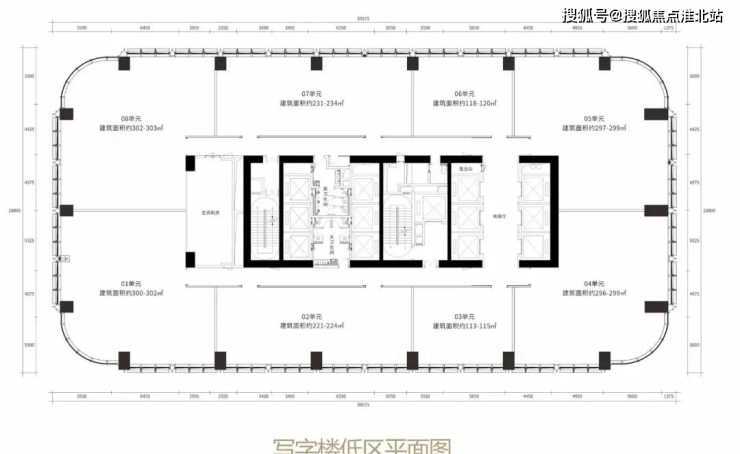 标准层面积约1900㎡,方正结构,承重柱贴边,可用性强,使用率约67-73%。
