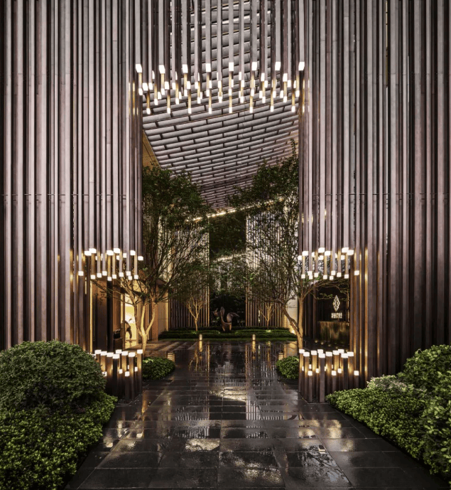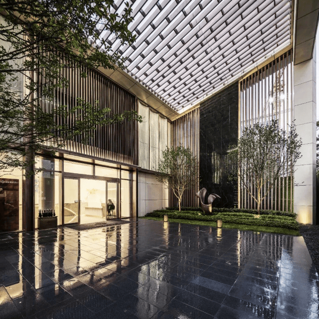 景观设计:浅米色外立面,线条简洁,营造出精致奢雅的美学气质。住区绿植如荫,会客廊架、阳光草坪、下沉式围合休闲庭院穿插其间,还有别具艺术气质的景观小品点缀,依势造景,层层递进,营造出立体丰富的归家风景。