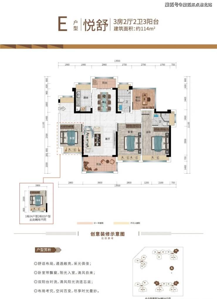 E户型:约114㎡ 3房2厅2卫3阳台