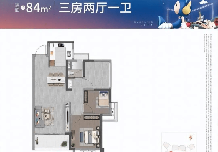 建面约88m²户型,做出了3房2厅2卫,实用率非常。