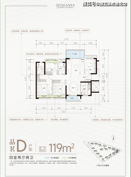 D户型:建面约119㎡,四房两厅两卫(658套)。科学布局空间,有理有序,南北双阳台、U型厨房、主卧套房式设计,舒适且私密。
