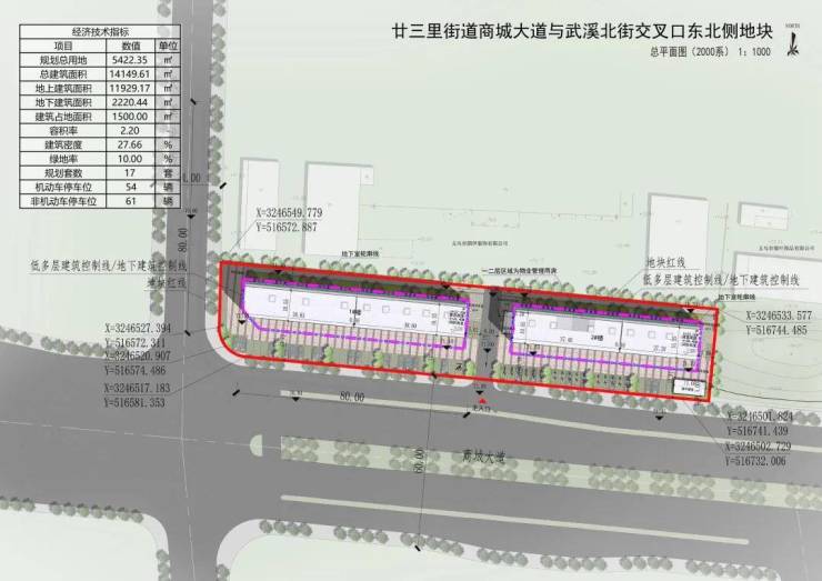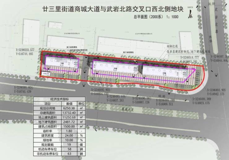 地块总建筑面积13732.40㎡,其中地上建筑面积11250.68㎡,地下建筑面积建筑2481.72㎡,容积率1.80,建筑密度24%,绿地率10%。机动车停车位58辆,非机动车停车位63辆。