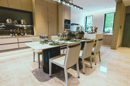 居住体验:排屋内部空间布局合理,如197㎡户型设计为4房2厅4卫,包含3个套房,顶层设有星空露台,地下室挑高约5.4米,可灵活改造为休闲娱乐空间。