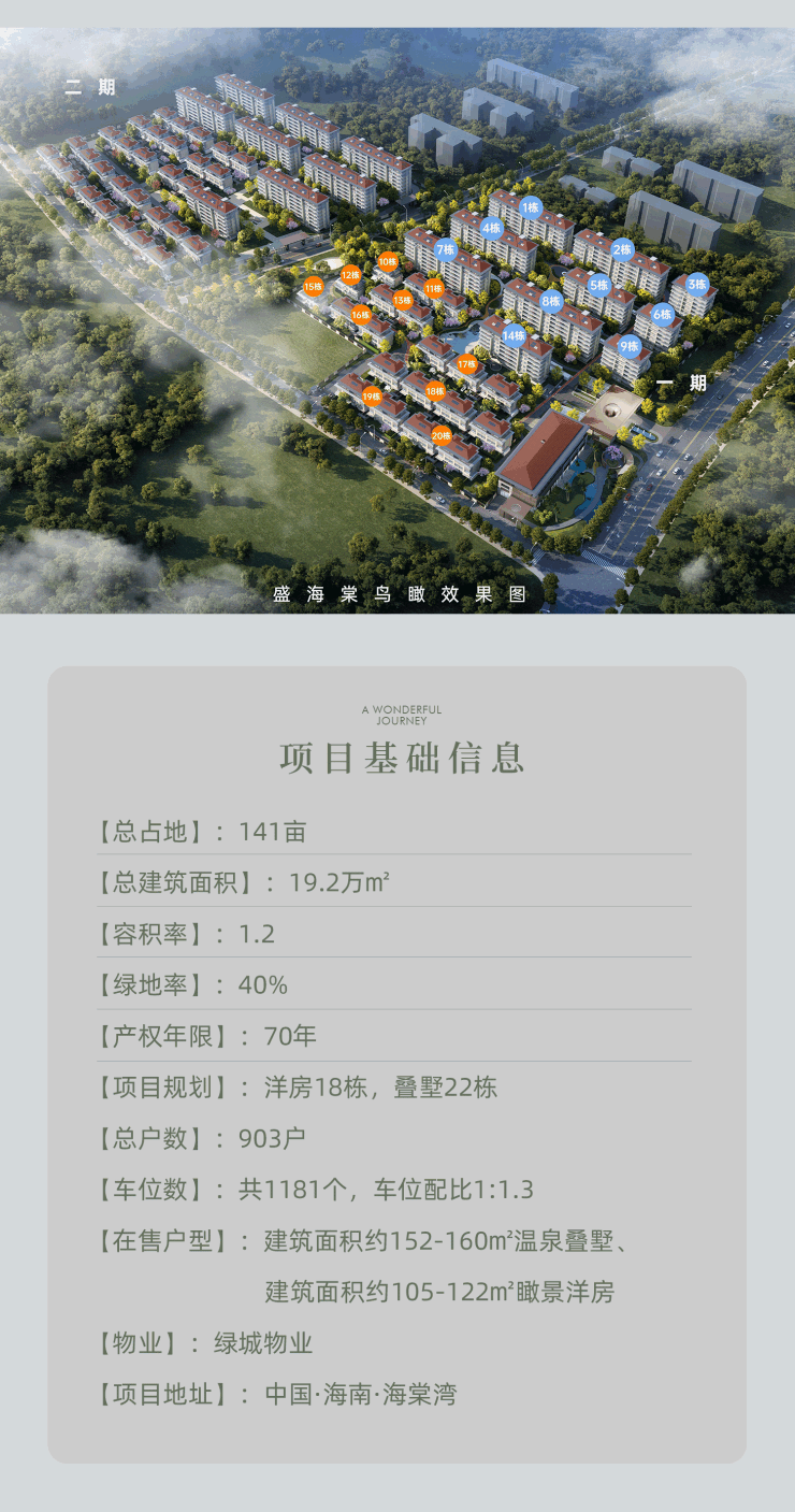 盛海棠总占地 141 亩,总建筑面积达 19.2 万平方米。其容积率仅为 1.2,绿地率却高达 40%,产权为 70 年 。项目规划有 18 栋洋房和 22 栋叠墅,总户数 903 户,同时配备了 1181 个车位,车位配比为 1:1.3 。目前热售的户型有建筑面积约 152 - 160㎡的温泉叠墅,以及约 105 - 122㎡的瞰景洋房,物业由知名的绿城物业负责。