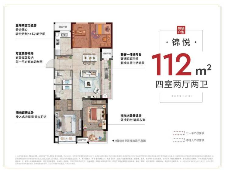 主推的112㎡边套锦悦户型,轻松满足各阶段家庭、创业青年的生活所需。四室两厅两卫多元空间,拥有3+1百变家庭户型格局,配套三房功能灵活,可规划书房、健身房,抑或合并儿童房,解锁生活更多可能。主卧套房设计,步入式衣帽间和私享卫浴,臻享静谧舒睡空间。餐客两区域独立而联通,空间实用开阔,双阳台灵动高效利用,尽情享受美好居家时光。