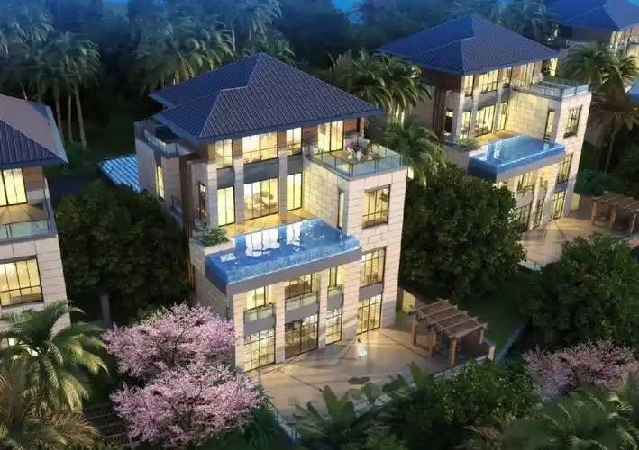 社区配套:主楼设有全日餐厅、SPA 中心、多功能会议室;园区规划中心泳池、热带庭院步道,建筑采用米黄色实墙 + 退台设计,融合热带绿植景观
