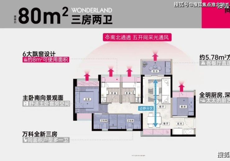 建面约80平户型,实现四开间朝阳,约5.78㎡方大阳台,主卧可实现南北对流,同等面积多一卫……每个点都戳中刚需的心。