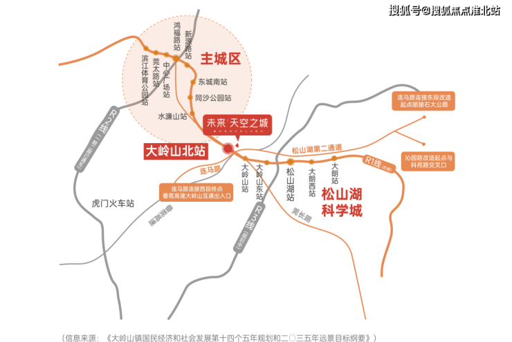项目位于大岭山北站出口,从此站点出发,2站到同沙公园、3站到松山湖、5站到鸿福路,不同站点演绎不一样的精彩。