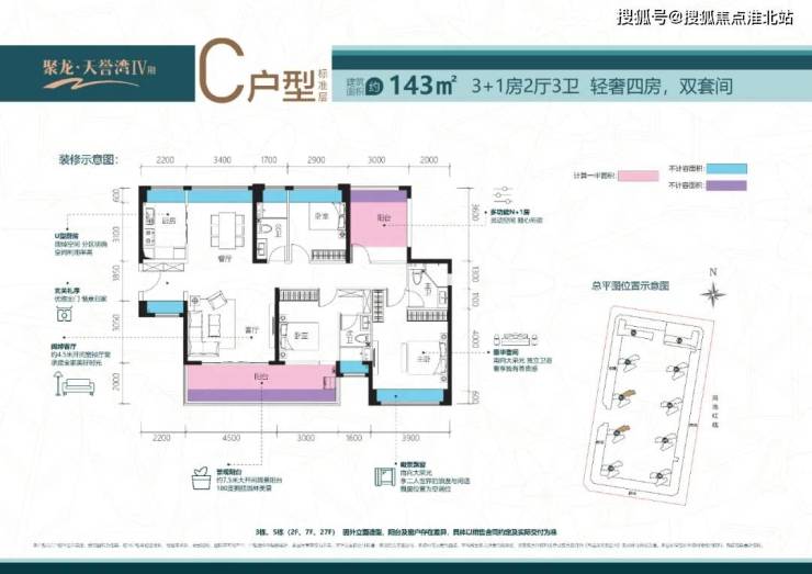 143平,四房两厅三卫 4.5米开间的客厅+7.5米开间的景观阳台,更是双套房设计,如此户型,实属石湾罕有。