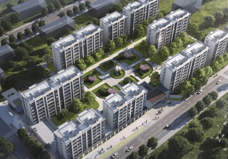 建筑类型:住宅部分有 7 幢 8 层住宅、2 幢 7 层住宅,均为板楼结构,建成后毛坯交付。此外,项目还有 22 间商铺。