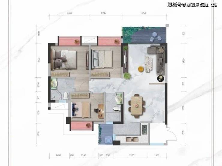 对比73㎡户型,90㎡三房更显宽阔一些,三房两卫一厨设计;L型厨房带有生活阳台;客厅有约3.7m的景观阳台,通风采光不错;主卧为套房,配独立的卫浴,私密性更强;另外两间次卧有飘窗,空间感更强。