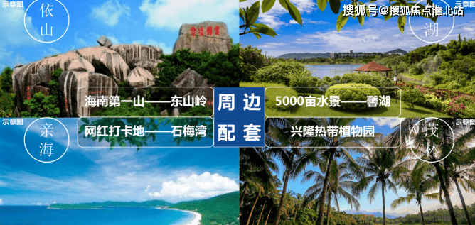 自然景观:背靠海南第一山东山岭,紧邻 4A 景区兴隆热带花园,私享 5000 亩馨湖,邻近石梅湾,周边还有世界仅存的两片青皮林之一,森林覆盖率高,负氧离子含量约 8000 个 /cm³。