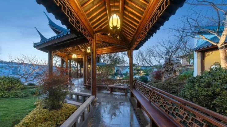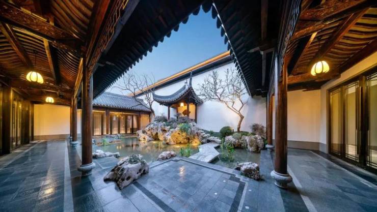 园林规划上,汲取“万园之园”拙政园“因地制宜,以水见长”的精髓,借义乌江两岸风光,打造约2000㎡中轴景观。水景蜿蜒如带,亭台错落其间,疏密有致的布局既显皇家气势,又藏江南灵秀,一轴八院的格局让自然与建筑共生共荣。