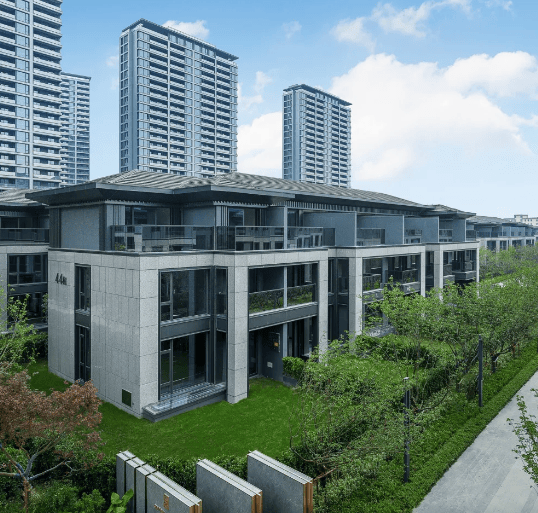 建筑细节:高层采用莫兰迪灰铝板+大玻面设计,排屋以珍珠蓝石材干挂,兼顾美观与实用性。