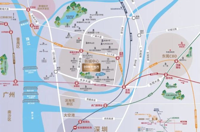 交通配套:项目为双站口 TOD 楼盘,约 500 米可达佛莞城轨麻涌站,约 1 公里可达 R1 线麻涌西站,通过穗深城轨、莞惠城轨等可通达大湾区。周边还有沿江高速、京港澳高速,可快速连接广州、东莞市区及深圳。