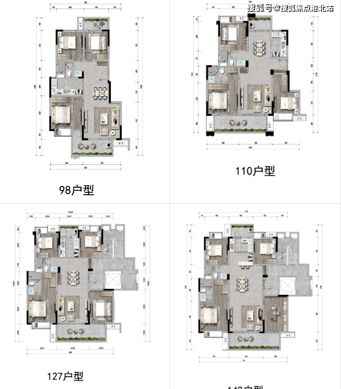 建面约 127㎡户型:4 室 2 厅 2 卫,全明格局,户型方正。