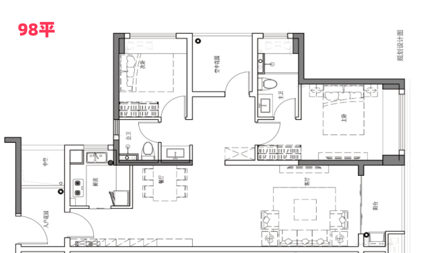 建面98㎡:南向三房两厅两卫,同样配备入户花园,开间较为常规,阳台宽度略显不足,但南向视野开阔,可望见奇龙大桥。