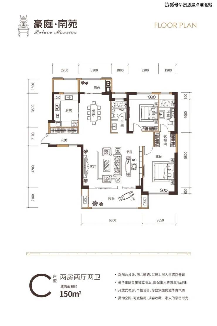 C户型建面约150㎡,双阳台设计,南北通透,主卧享有衣帽间及独立卫生间,6.6米宽的客厅可满足开放式书房设计,尽显书香人家华贵气质,同时6.6米宽景大阳台,享受无线开阔的视野,又可从容收藏一家人的亲密时光。