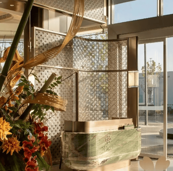售楼处汲取江南水乡文化元素,运用镂空金属纹理、翠绿大理石纹等材质,结合大型花艺作品《嘉禾》,营造出兼具东方诗意与现代美学的空间氛围,体现对地域文化的传承与创新。