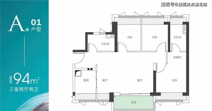 A座01户型-建面约94m² 三房两厅两卫