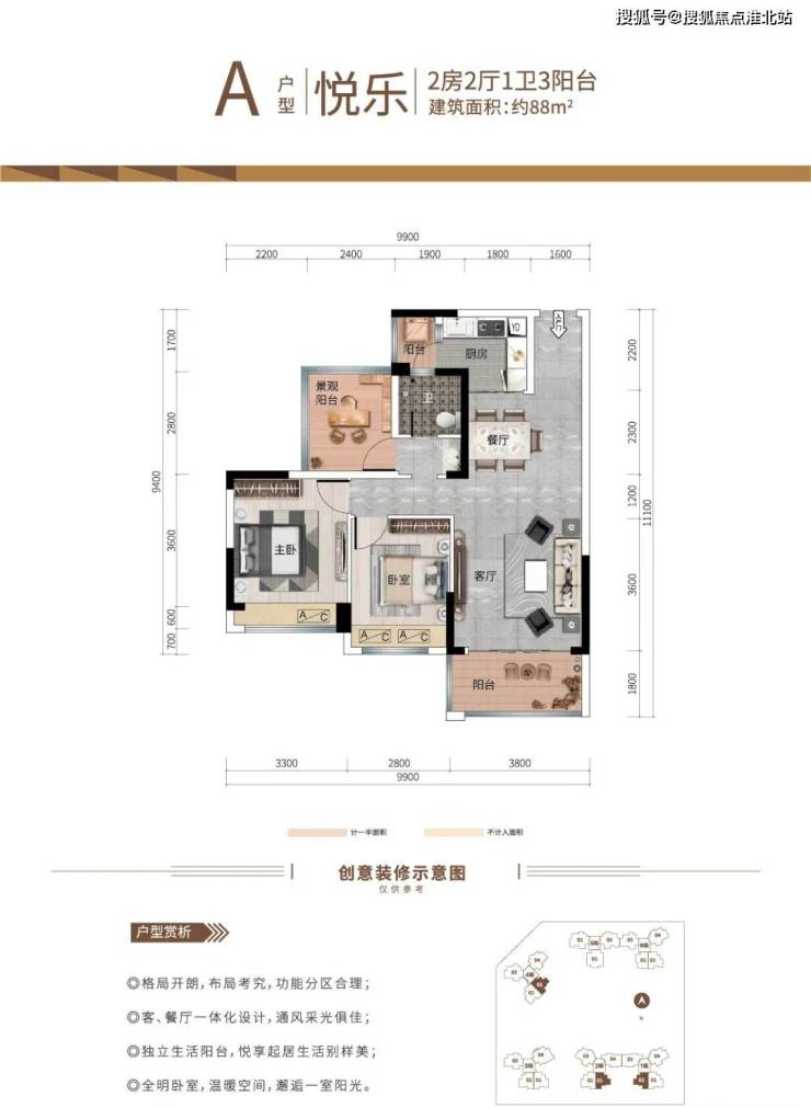 A户型:约88㎡ 2房2厅1卫3阳台