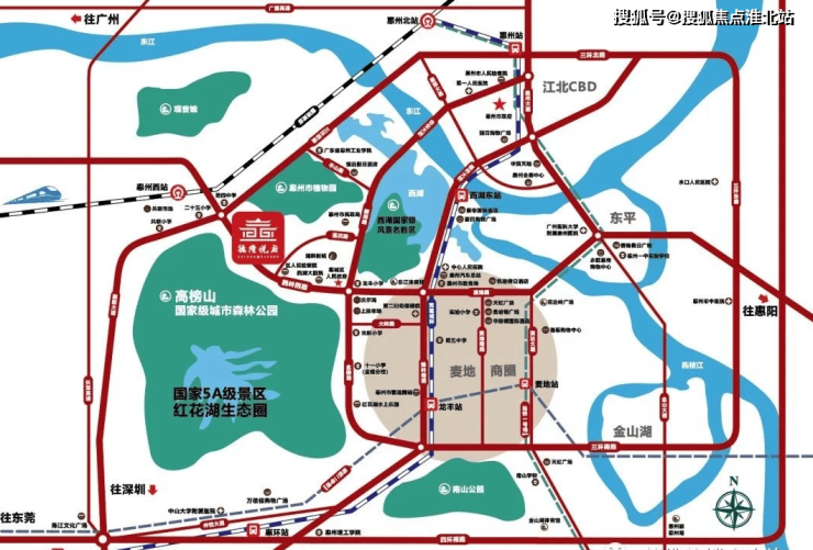 市中心的生态区:高榜山脚下、红花湖景区与惠州西湖左右相伴,背靠惠州市植物园。区政府、图书馆、西湖大剧院、文化馆及青少年宫……生态、文化、自然多重资源叠加,生活格调与众不同。