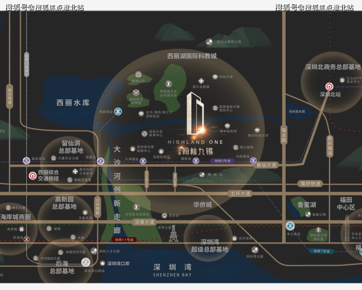 留仙大道正席,紧邻地铁5号线塘朗站,4/5/7号线3轨环绕,毗邻“三纵五横”主干道,瞬息通达全城。西丽高铁站(建设中)、深圳北站两大枢纽环绕,拥有世界交通能级。
