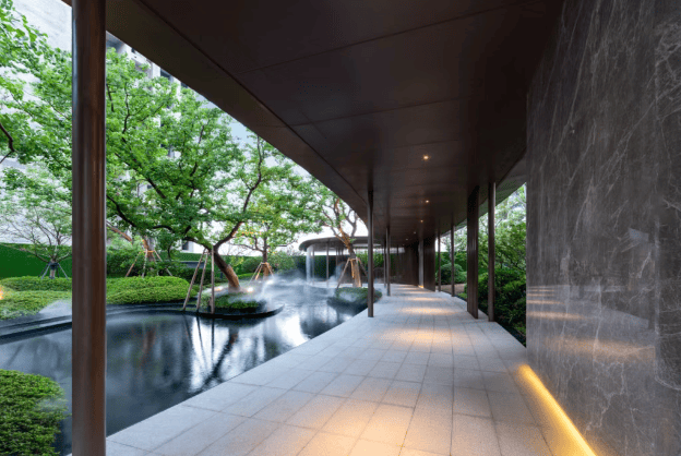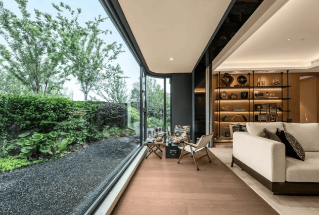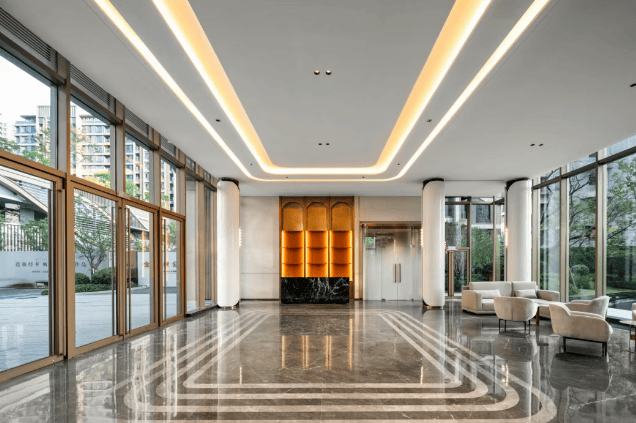 归家仪式感:约 6 米挑高的地上入户大堂,暖灰色仿石砖地面与牙白色岩板墙面碰撞出沉稳气场,仿古铜金属饰面与矩阵灯的点缀,让简约中透着精致;电梯厅内,定制香槟色系金属门框搭配通透落地玻璃,与室外的公园景致自然衔接,归家的仪式感十足。