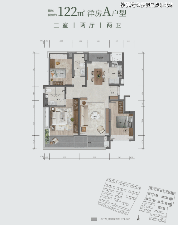 洋房 A 户型:建筑面积约 122㎡(或 124.9㎡),三室两厅两卫。全明通透,南北通透双阳台,主卧套房设计,LDKB 一体化阔厅联通约 8.3 米南向宽景阳台,主卧还有 270° 环幕阳台。