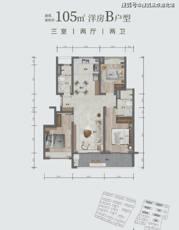 洋房 B 户型:面积约 105㎡(或 105.8㎡),三室两厅两卫。三开间朝南,南北通透,主卧联通约 6.7 米南向阳台。双厅竖向 LDKB 一体格局,空间利用率高。