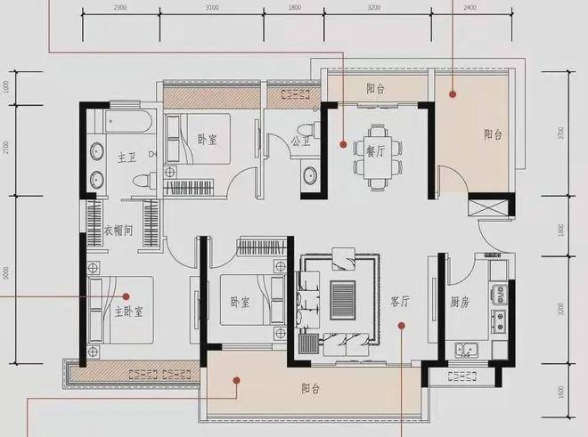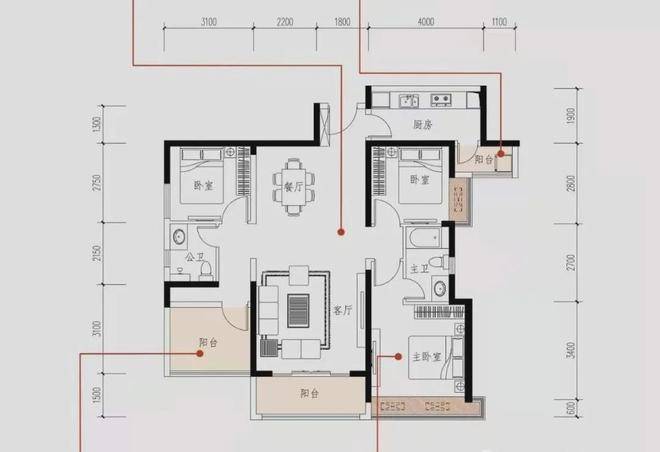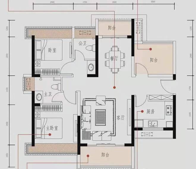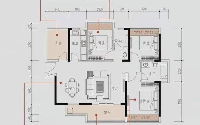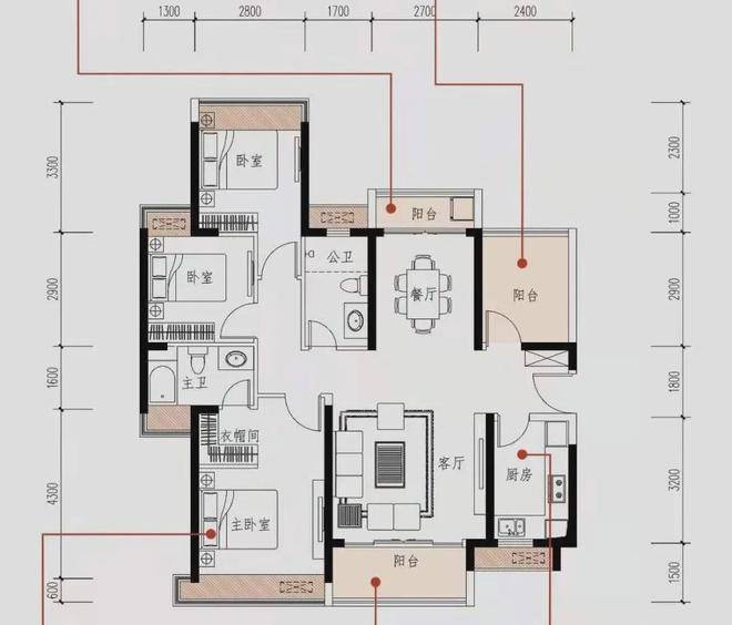 A户型:约117㎡ 4房2厅2卫亮点:餐客厅双阳台 奢阔主卧