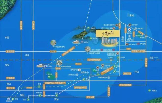 1轴:毗邻205国道,直接连通龙岗大道,20分钟即达深圳,35分钟直达龙岗中心。
