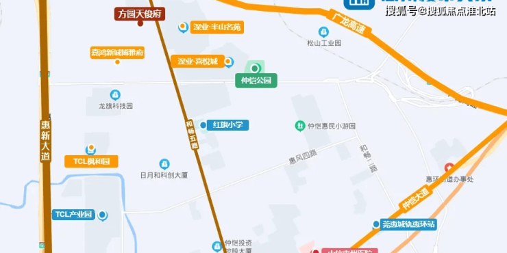 项目所在区域交通便利,广龙高速、惠新大道、仲恺大道等城市交通道路完善,莞惠城轨惠环站也在附近。此外,片区的生活配套也非常成熟,项目的学区有红旗小学和仲恺第二中学, 距离项目不远的还有仲恺公园、中信惠州医院、T-Park等设施。