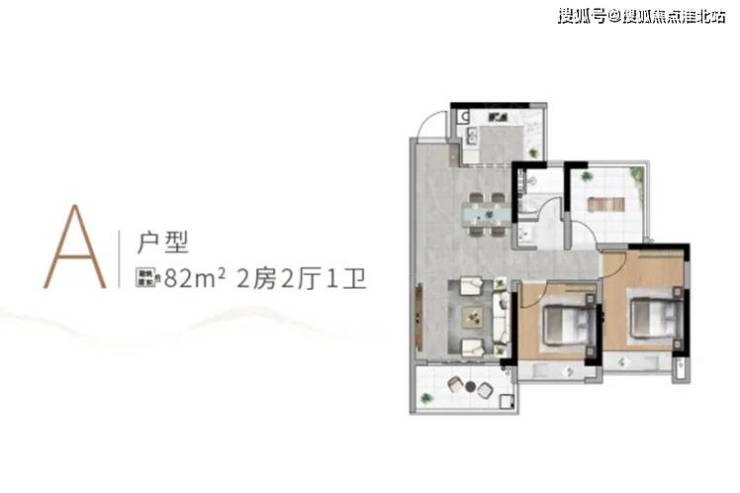 除了园林设计,项目的户型也有不少亮点。建面约82㎡2+1房2厅1卫户型,格局方正,竖厅设计,三开间朝南采光不错。