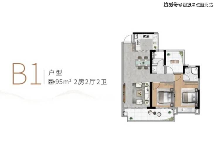 同样也是竖厅设计,建面约95㎡的2+1房2厅2卫户型,格局方正,自带6.5米朝南阳台,采光很不错。