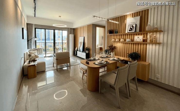 入门玄关处,是一处生活阳台,后期可打造成书房等多功能空间。客餐双厅是传统横厅设计,南北双阳台更加通透,6.8米的景观阳台可以成为日常休闲的好去处。