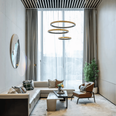 精装品质:部分房源为精装修交付,采用菲斯曼地暖、日立中央空调、西门子厨电、科勒洁具等一线品牌,全屋墙纸、定制橱柜等细节彰显品质,兼顾美观与实用性。