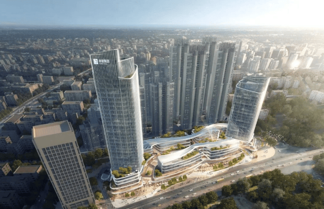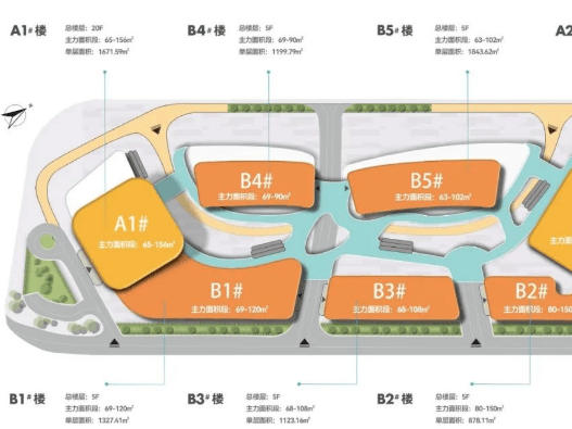 楼栋分布:由 2 栋塔楼和 5 栋盒子组成,两栋塔楼 A1、A2 分别为 20 层和 29 层,盒子 B1、B2、B3、B4、B5 均为 5 层,且 1-2 层为自持运营的商业。
