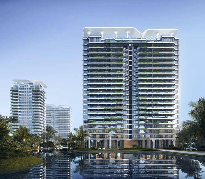 建筑风格:现代简约滨海风,横向铝板 + 弧形玻璃幕墙,纯板式错位布局,强调南北通透与景观渗透,部分第四代住宅户型带挑高空中花池 / 露台。