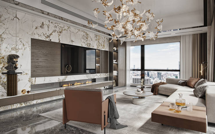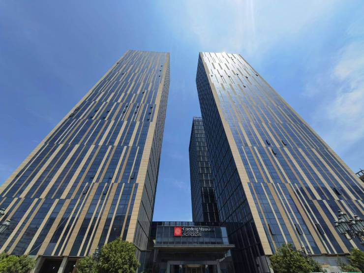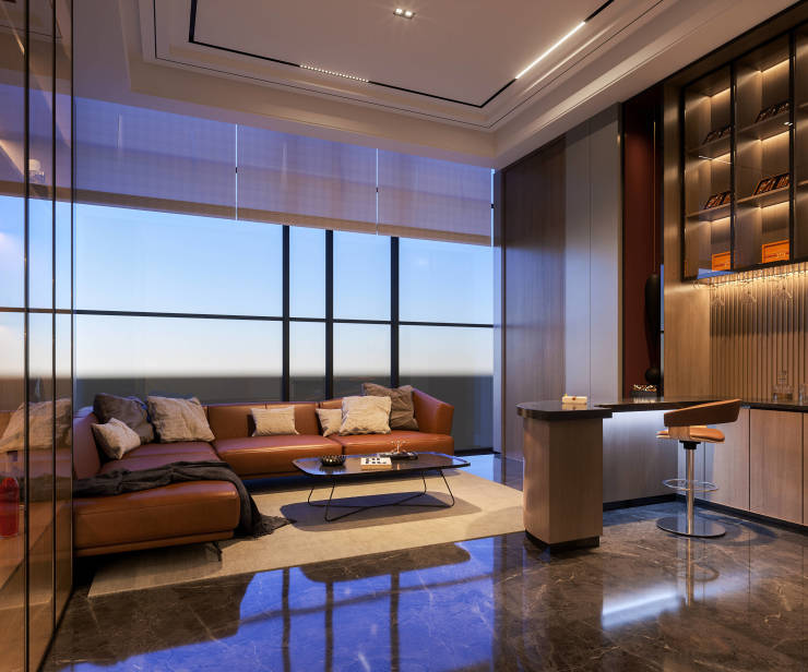 建筑设计:外立面采用大面积玻璃幕墙与干挂石材,融合现代美学与科技感,以 “环幕视野” 为理念,打造 270° 三面瞰景的视觉体验。
