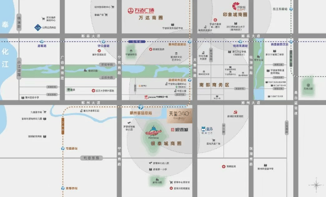 商业配套:周边商业氛围浓厚,南面紧邻宁波环球银泰城,北面一路之隔有宝龙一城商场、商会国贸中心和 8 万㎡的水街,还有星空里、罗蒙环球乐园等。此外,鄞州万达、印象城、联盛广场等多个综合性商业广场也在附近,可满足购物、娱乐、餐饮等各种需求。
