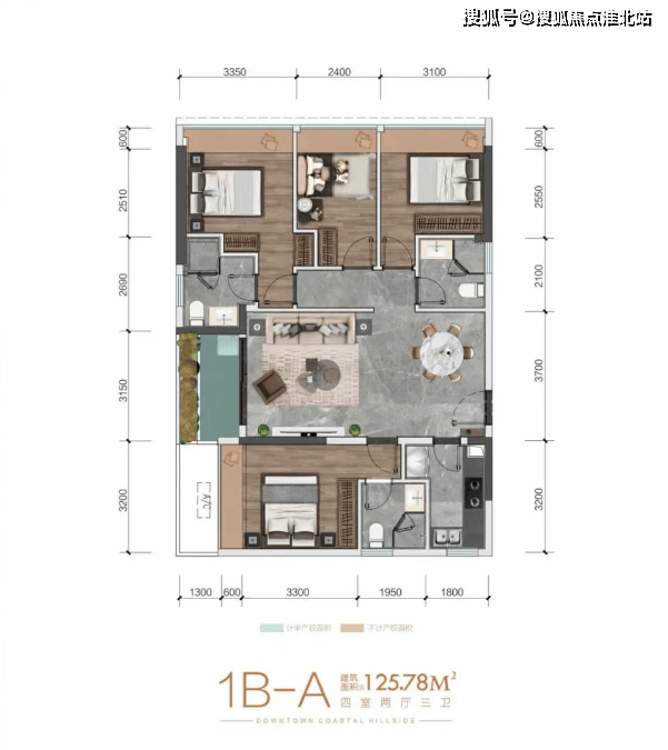 A 户型:建筑面积约 126㎡,四室两厅三卫。奢雅全明户型,入户玄关处有鞋柜设计,客餐厅一体化,客厅连通超大观景阳台,L 型厨房双灶台设计,预留双开门冰箱位置,双主卧设置,主卧可观看白鹭公园及三亚湾海景,东向卧室可看山景及中庭景观。