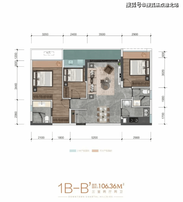 B 户型:建筑面积约 106㎡,三室两厅两卫。全景通透三房,每个空间都朝明,透风采光俱佳,主卧空间开阔,带独立卫生间,独立式 L 型厨房隔绝油烟,客餐厅一体化设计,约 9 米的观景阳台与客厅相衔接。