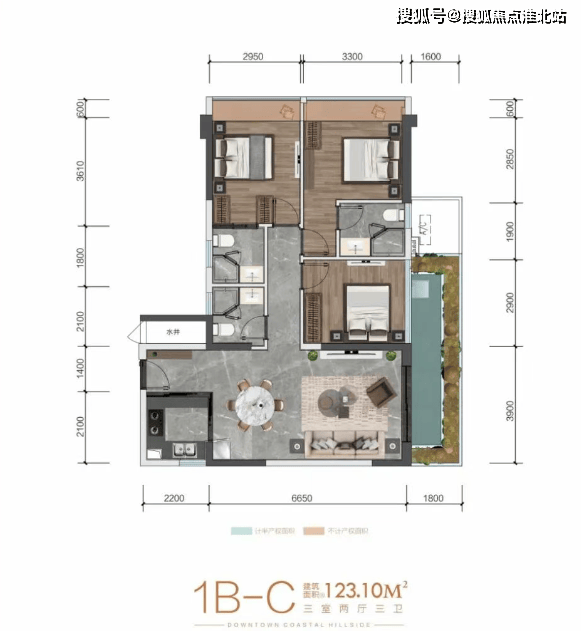 C 户型:建筑面积约 121㎡,三室两厅三卫。户型拥有正南向景观,南北通透,布局紧凑,厨房双灶台设计,客厅朝南外置约 10 米长的正南向阳台,可欣赏鹿回头公园景观,卧室均带落地窗,动静分离布局合理,内侧餐客生活区,外侧卧室区。
