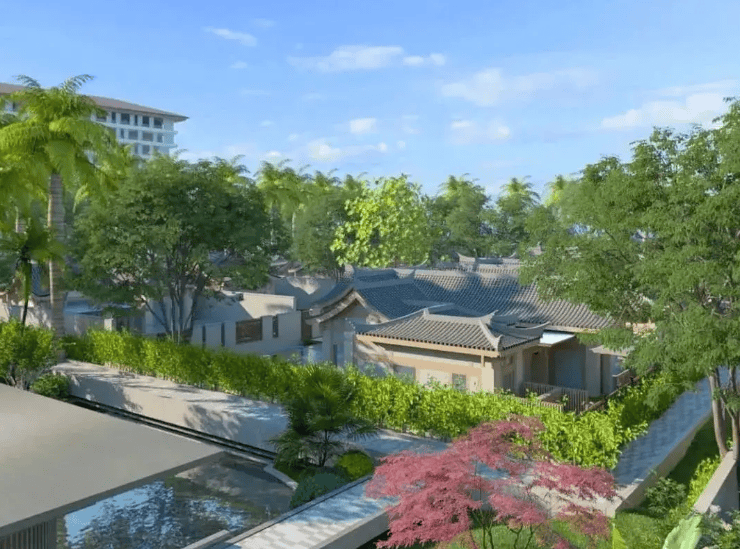 建筑风格:中式传统悬山顶 / 庑殿顶形制,飞檐翘角,石材 + 木构外立面,院落式布局,私密性极强;二期为万豪管理的泰康之家度假酒店(臻品之选,2022 年开业,共享高端餐饮、会议、康养设施)。