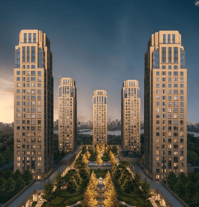建筑设计:采用新古典主义风格,6 栋建筑外立面选用经典的米黄色色调,以三段式古典构造形式呈现,外墙立面追求凹凸有致、严谨的建筑比例和极致的对称之美,演绎出欧式宫廷气质。