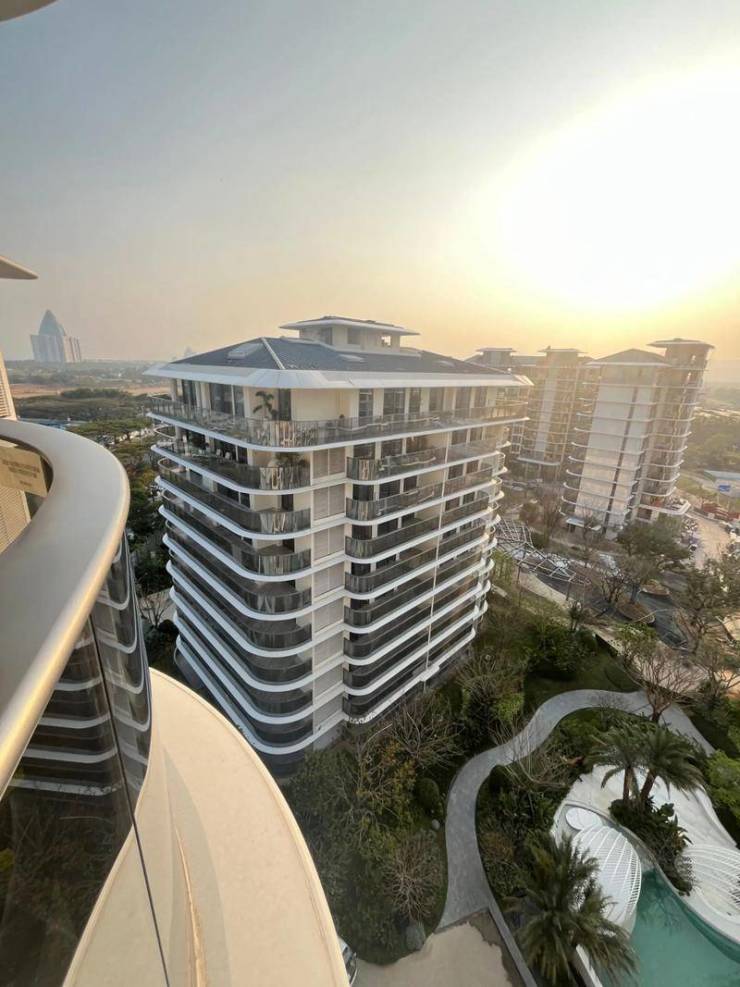 140㎡ 三室两厅两卫:板式通透,大转角阳台,独立电梯厅,适合高端度假与家庭常住;
